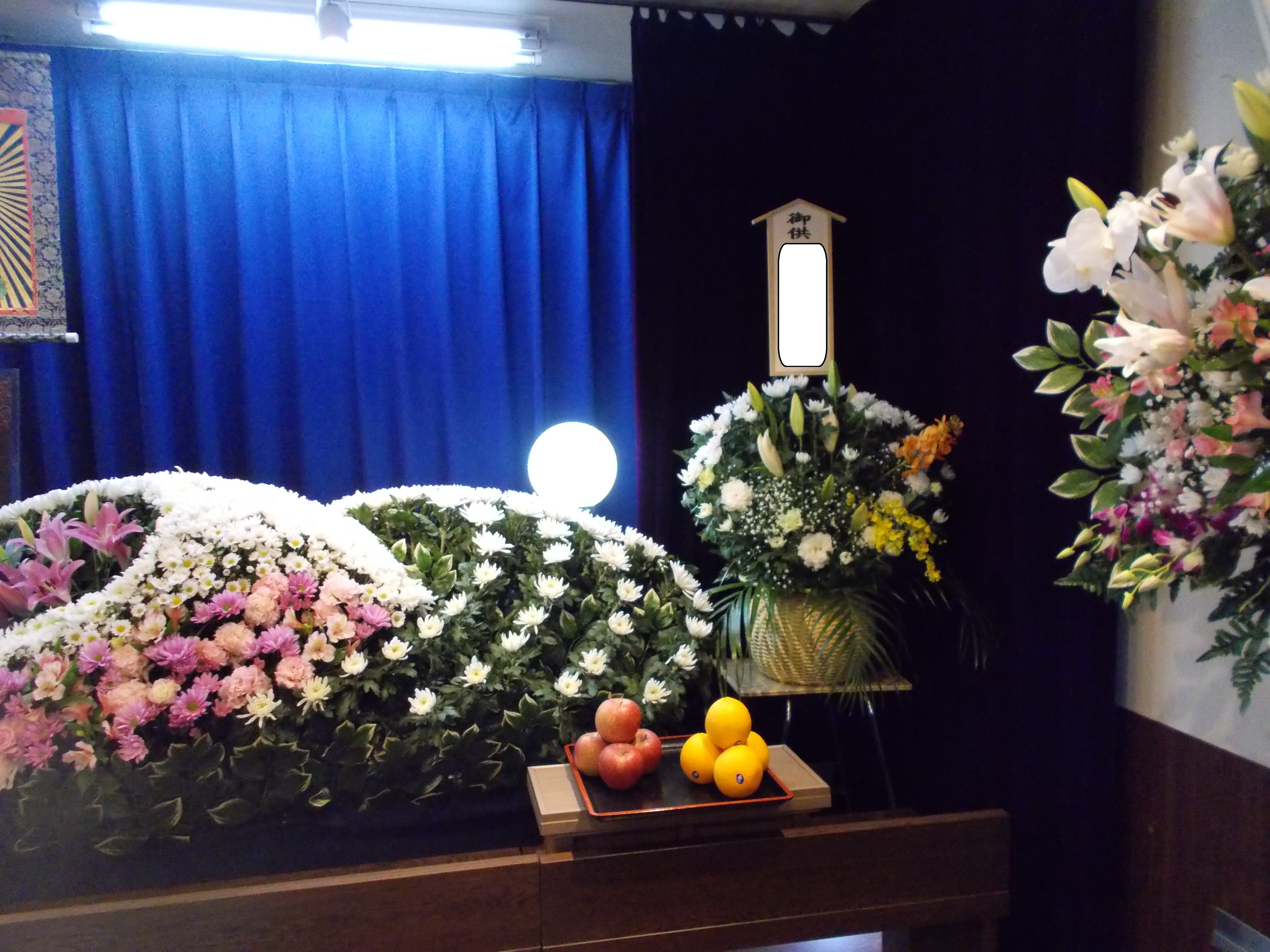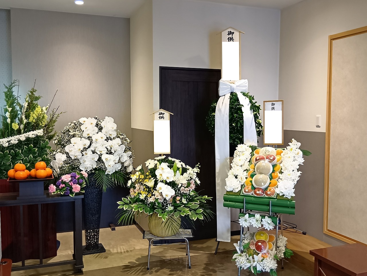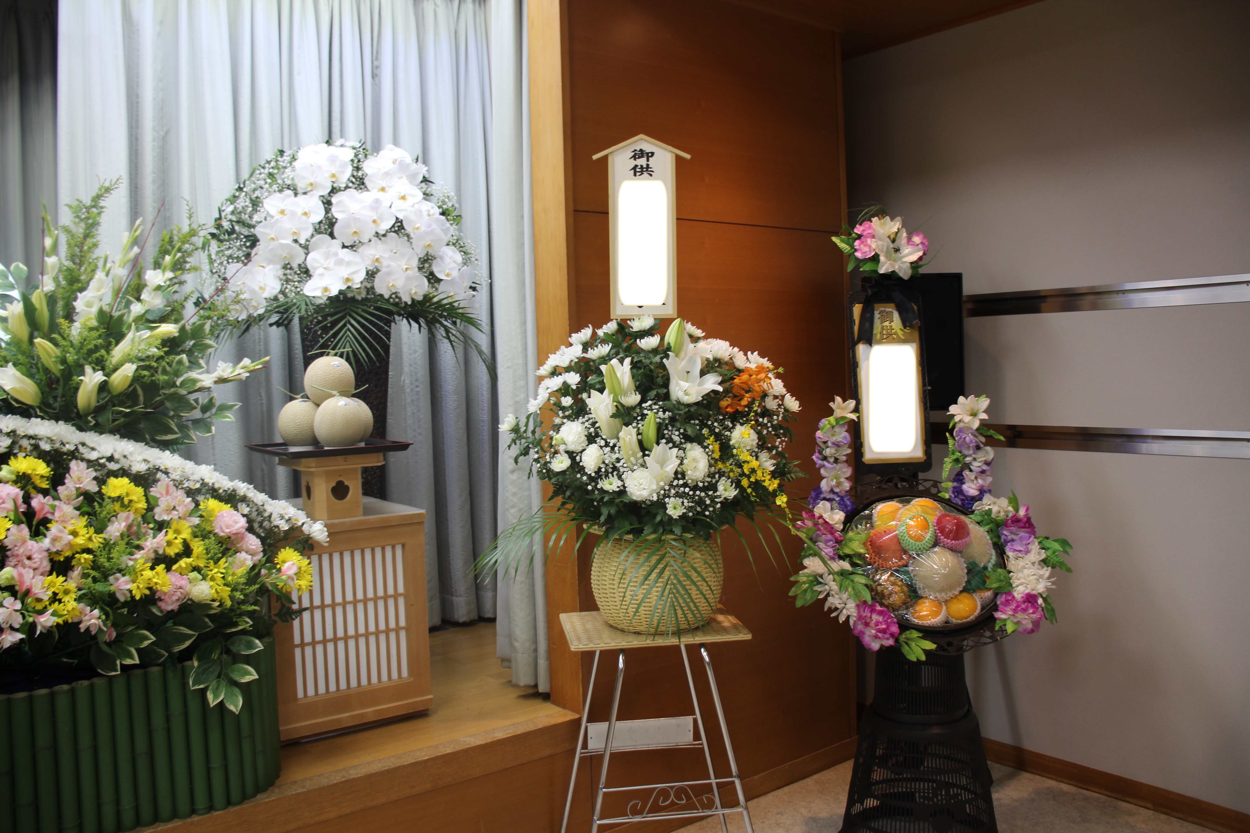 式場内にはたくさんのお花や果物をお供えしていただきました