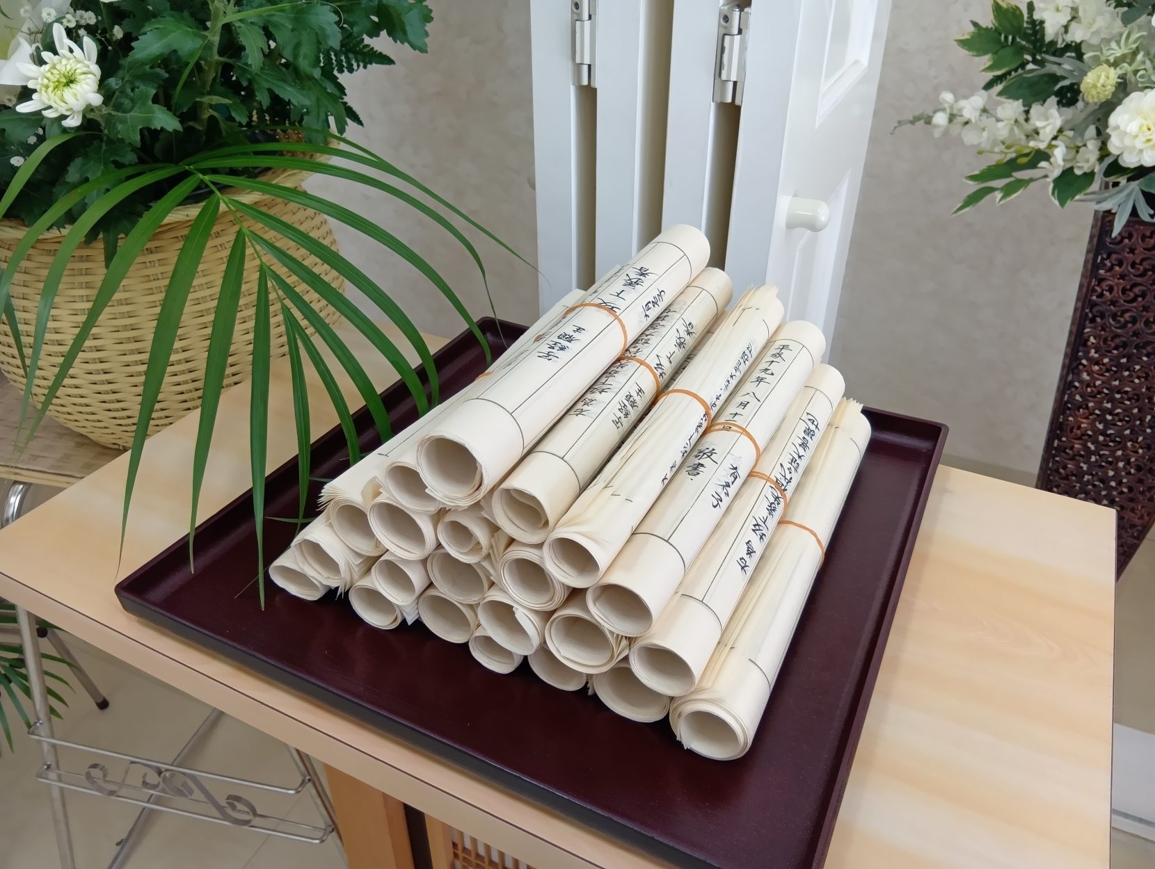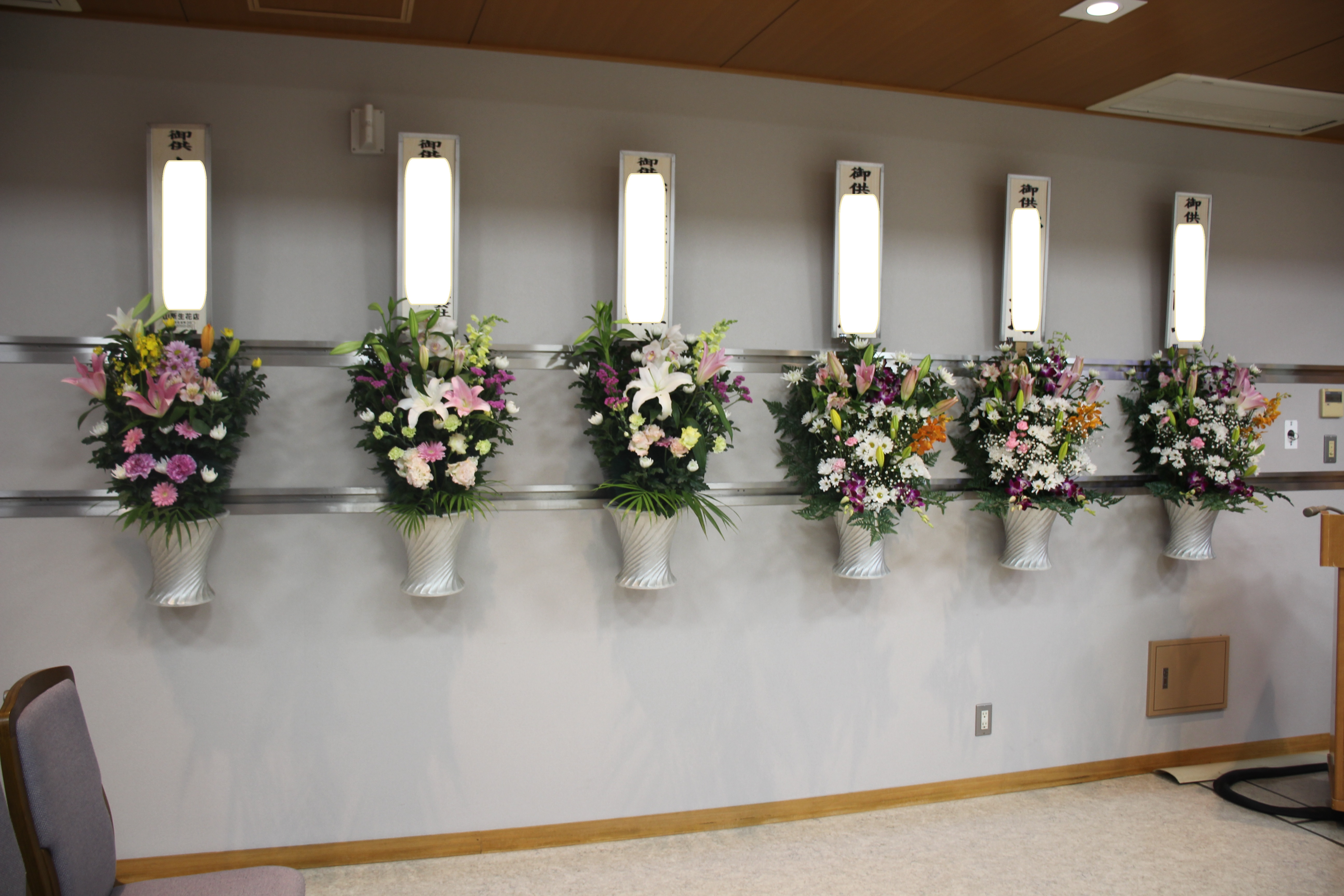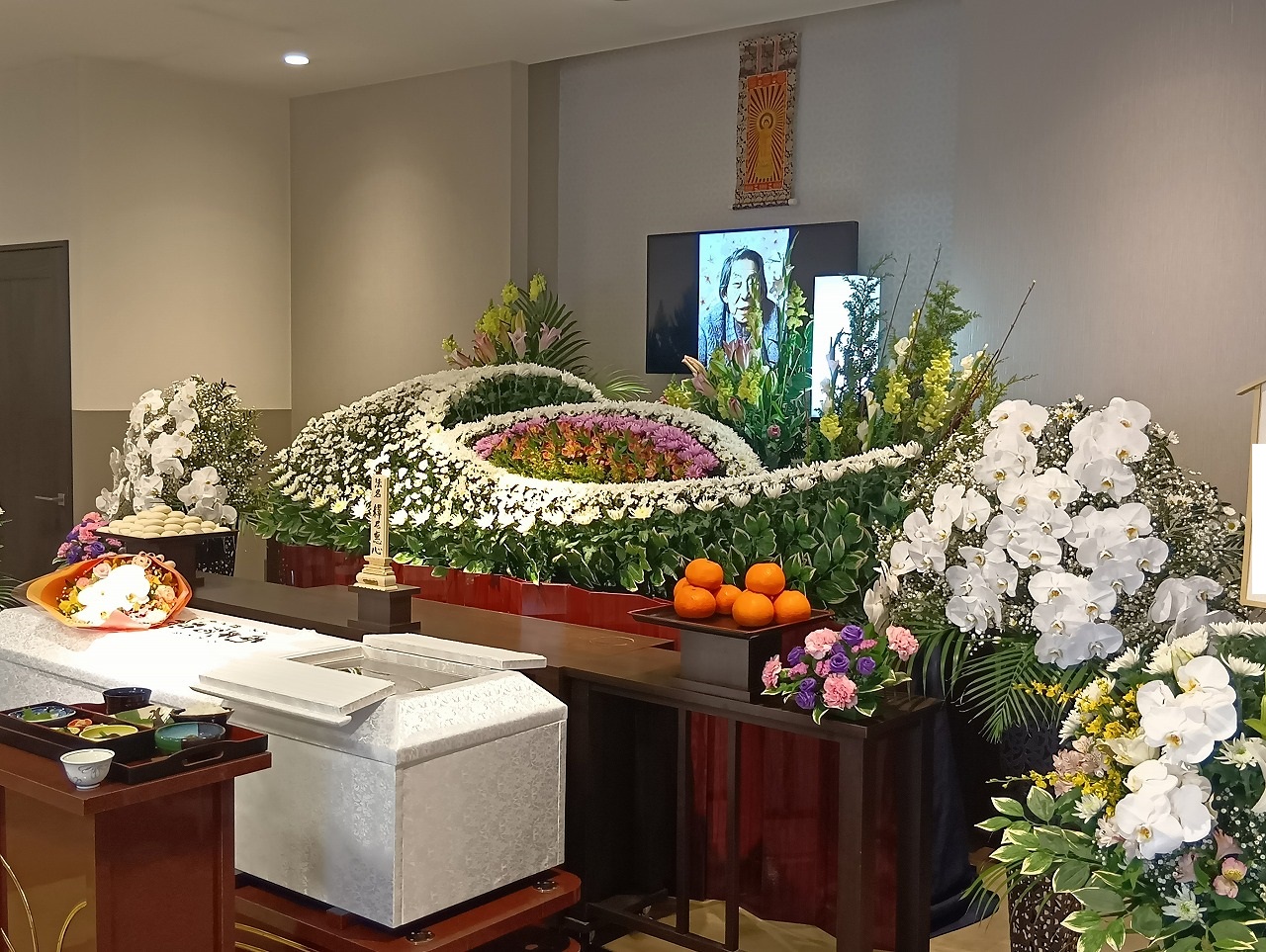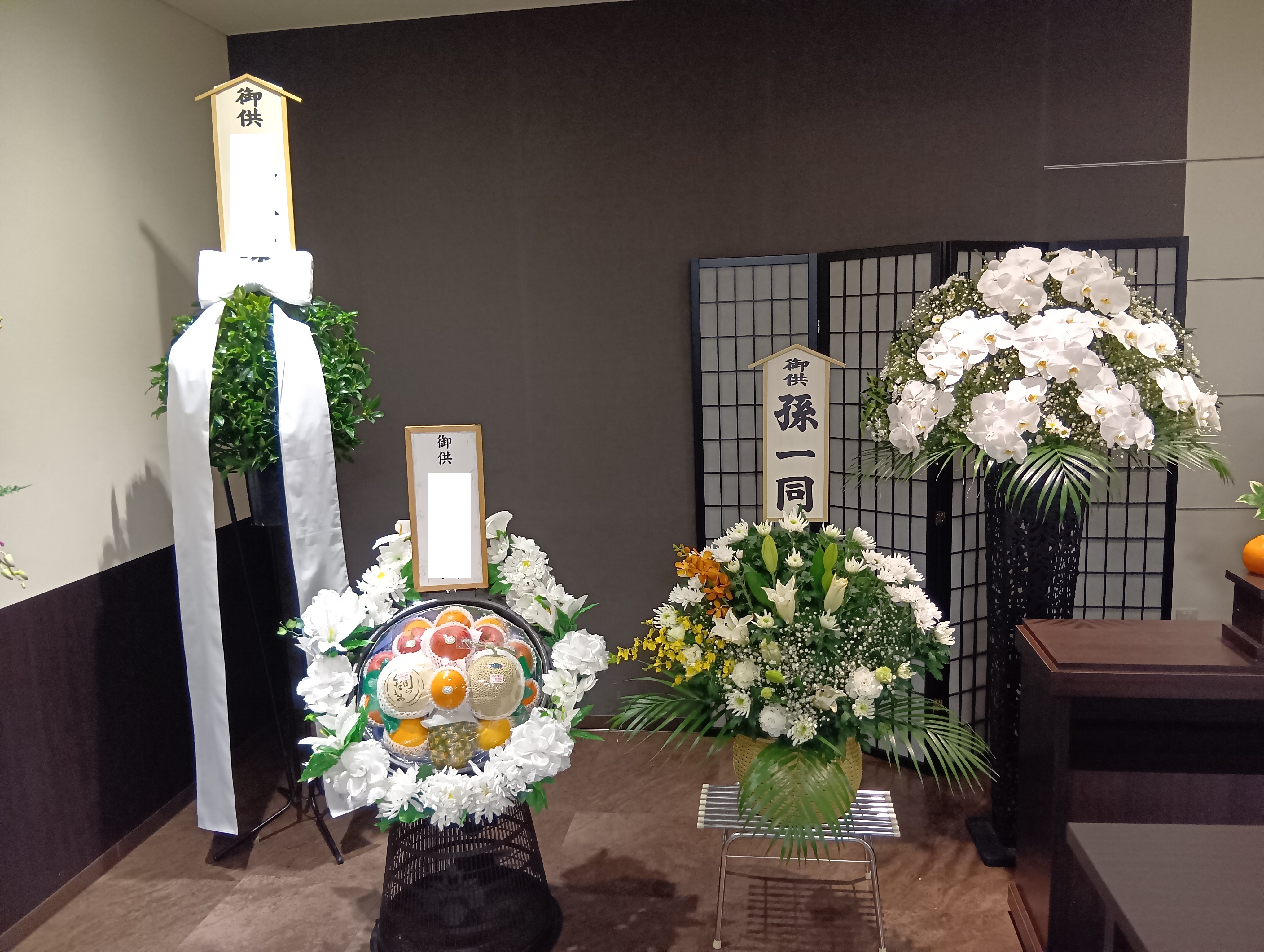 式場内にはたくさんのお花や果物をお供えしていただきました