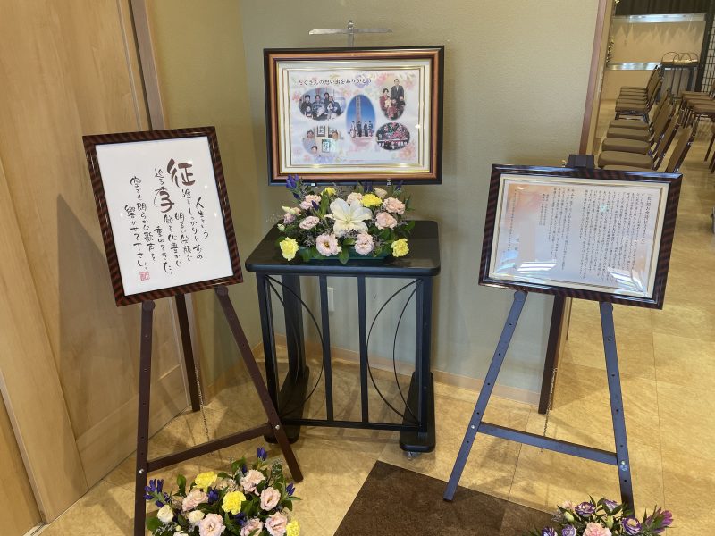 会館の入り口には思い出のお写真とお名前で作らせて頂いた詩を展示させていただきました