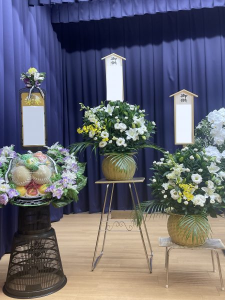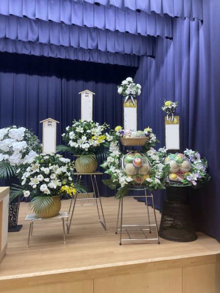 式場には皆様からの沢山のお花や果物で式場が彩られます