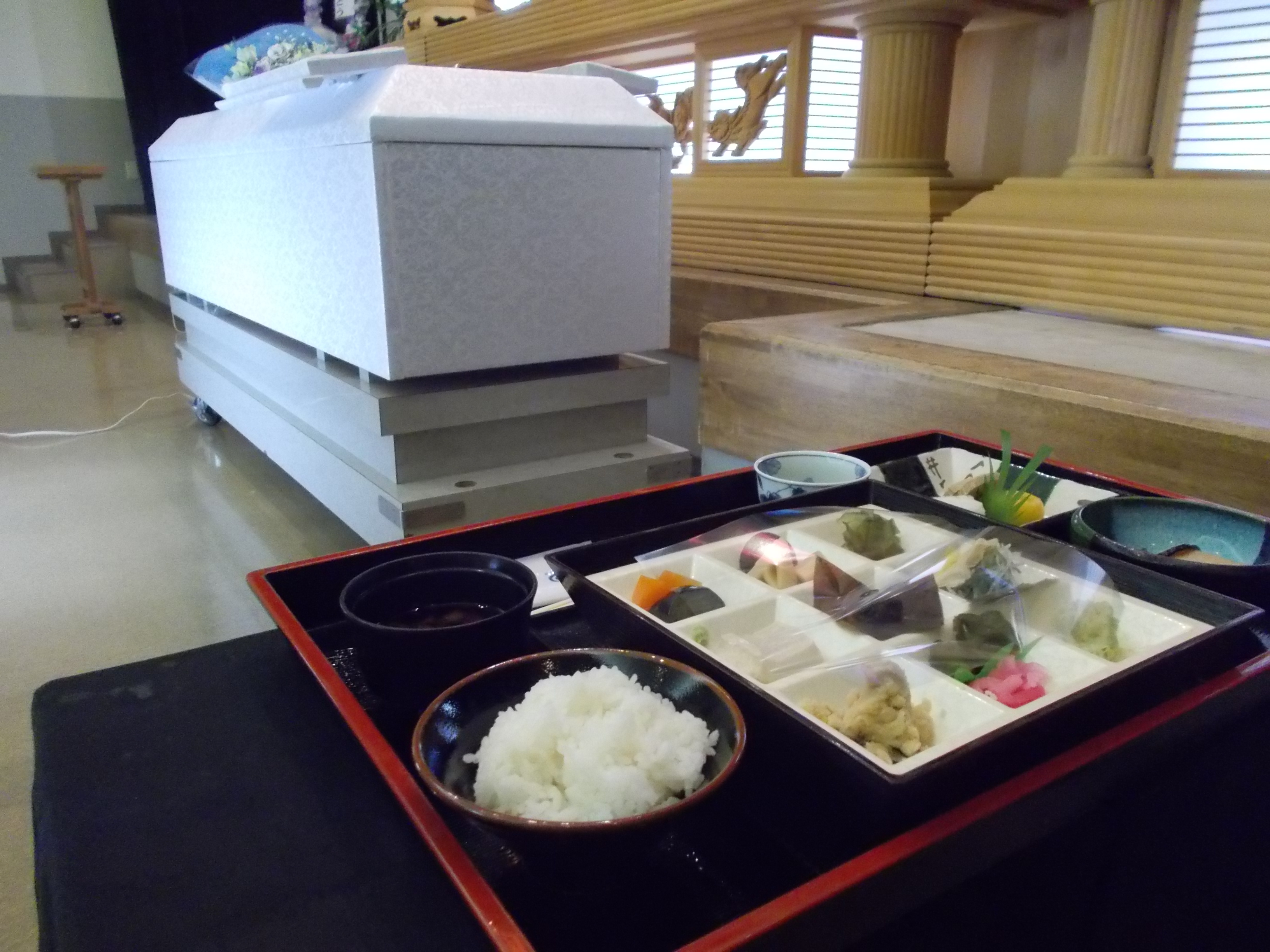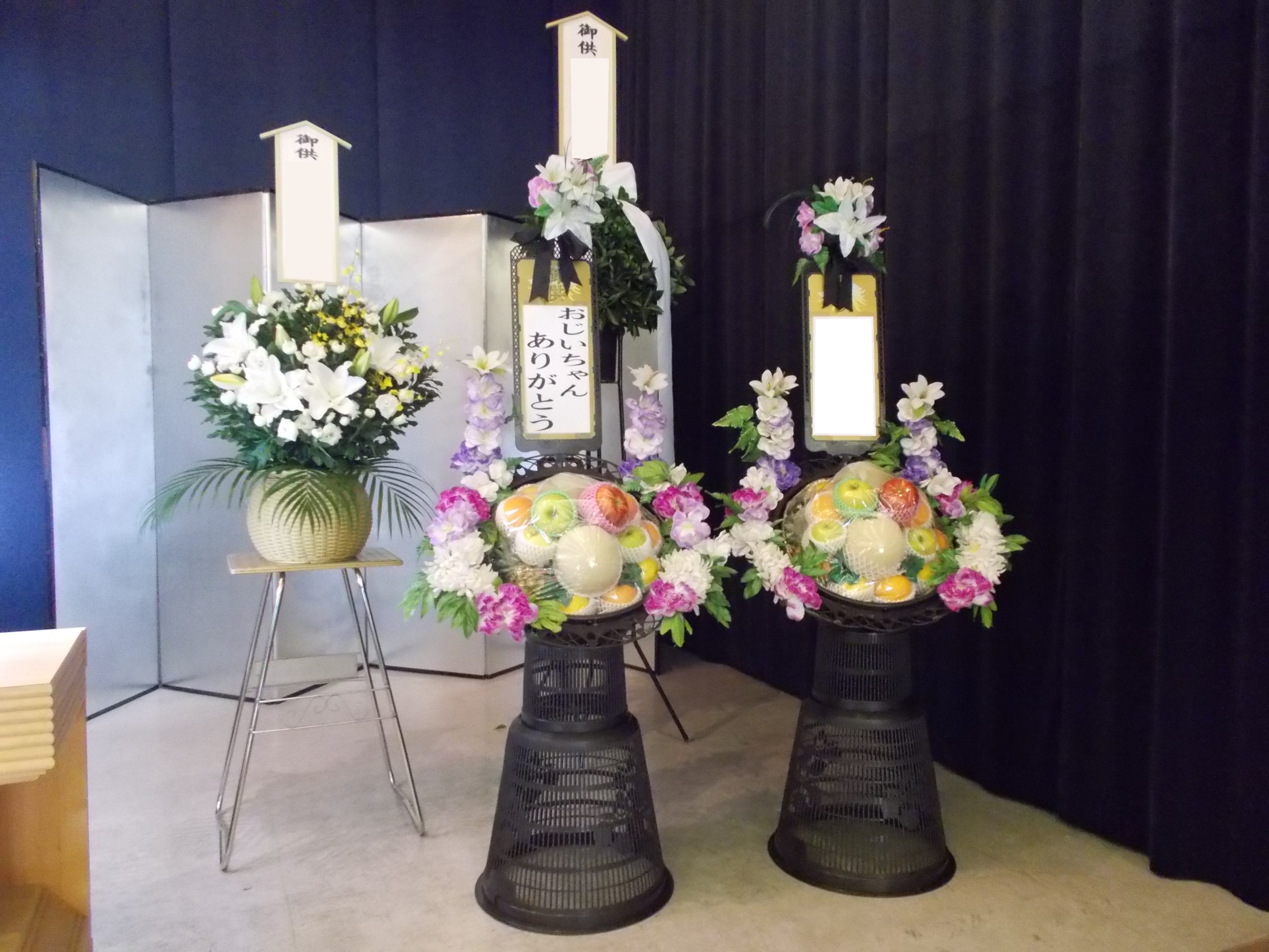 各方面からのお供え物 また、故人様の近くにはお斎のお供えです。