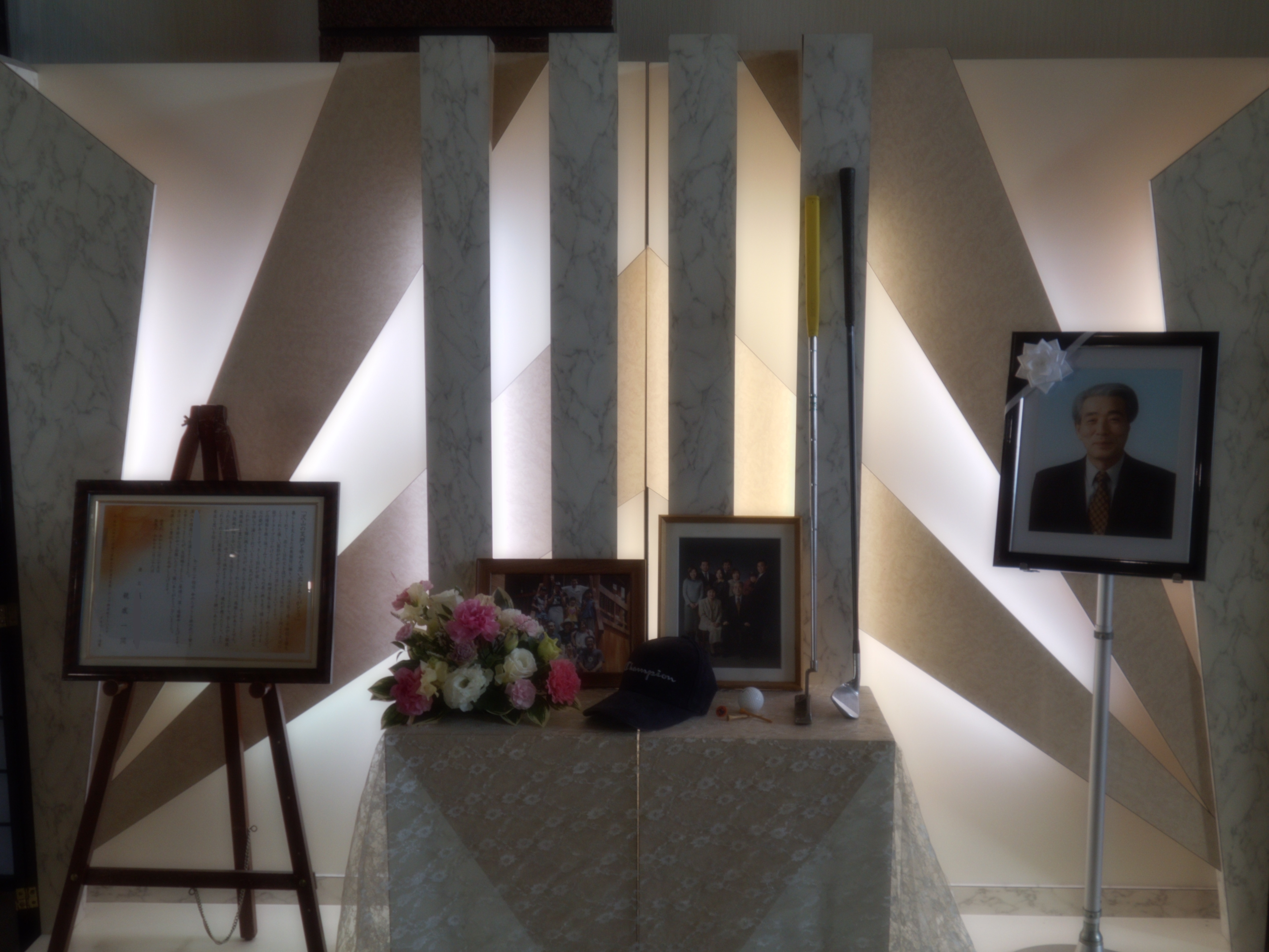式場入り口には愛用のゴルフクラブやゴールなどが展示されお礼状と遺影写真と共に在りし日を思い起こさせてくれます