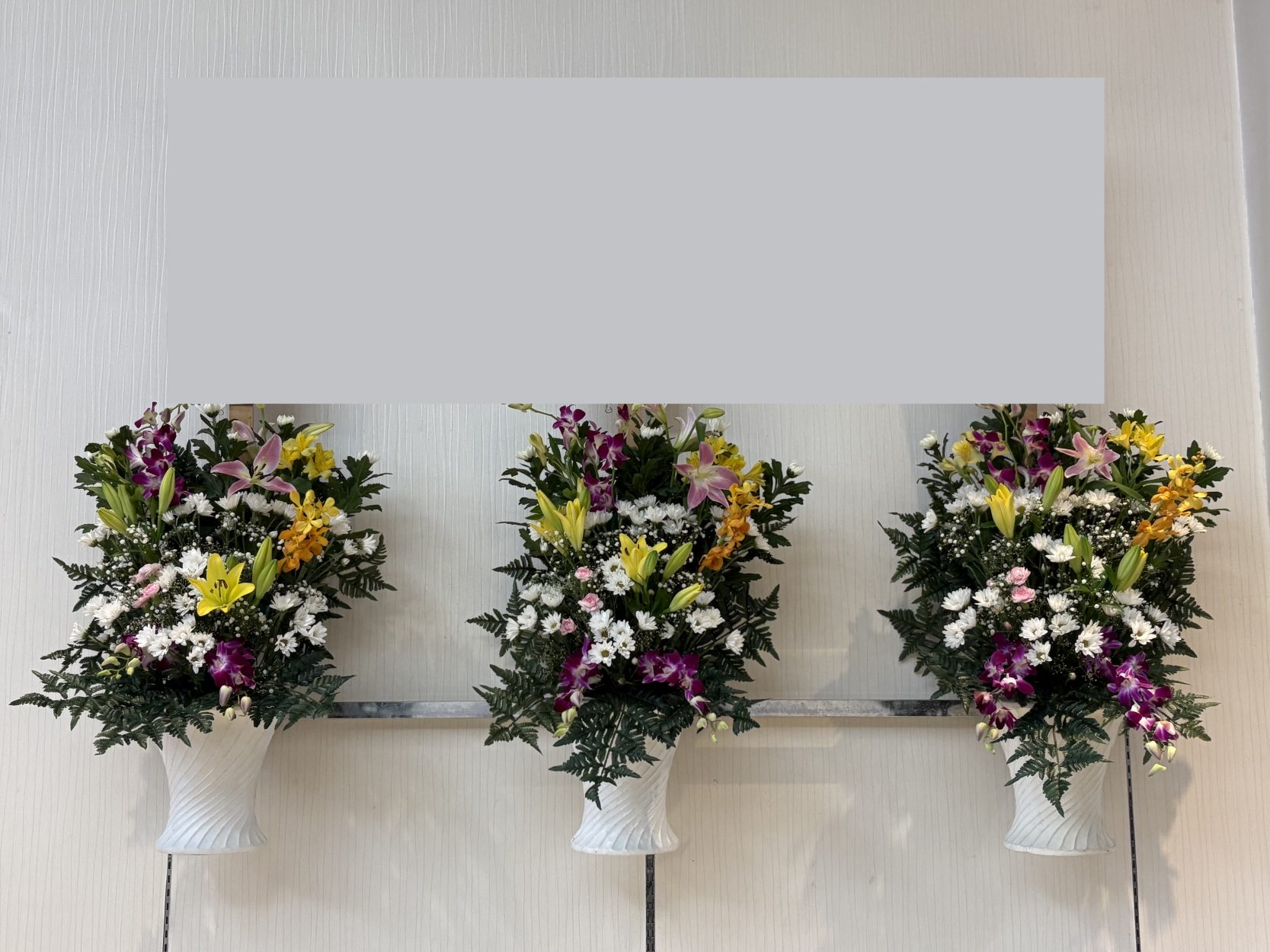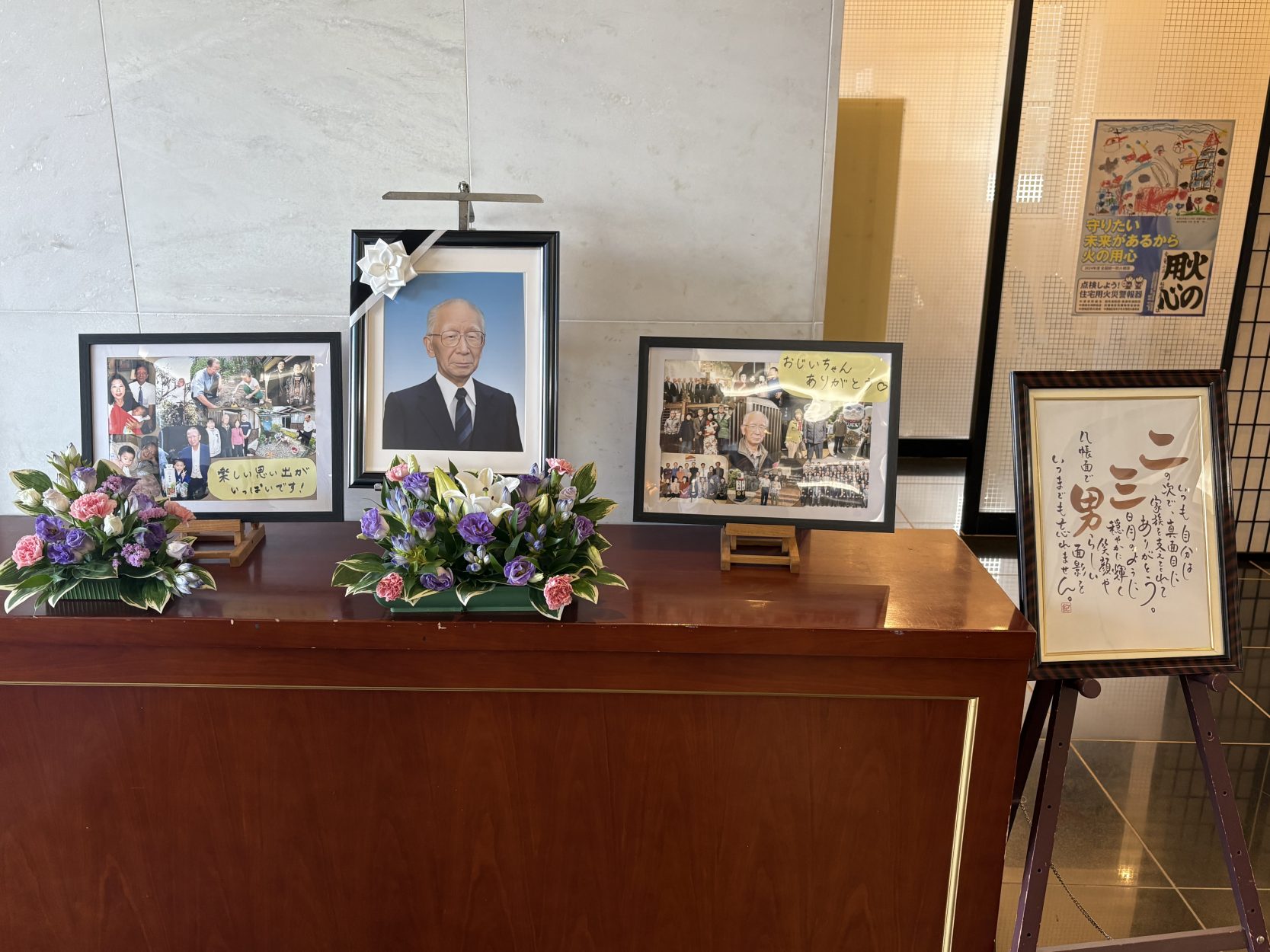 会館の入り口にはお名前で作らせていただいた詩や当家様が作製されたお写真のボードを展示させていただきました