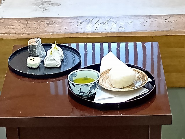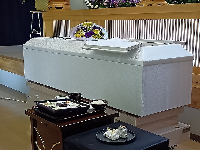 故人様のお近くには大好きだったおにぎりやゆで卵、甘いお菓子をお供えさせていただきました