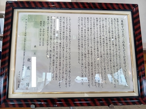 喪主様からの想いが綴られた会葬礼状を飾らせていただきました